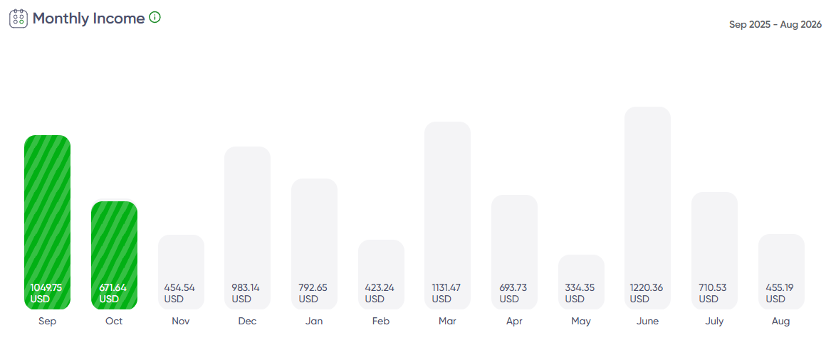 - Monthly Income Trend: some months already cracking $1,000 — September crossed four digits